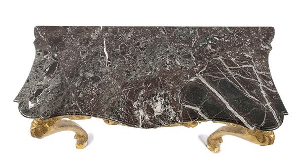 gambe intagliate con piedi a zoccolo equino, fascia decorata da elementi fogliacei con conchiglia centrale, piano sagomato in finto marmo.
