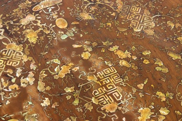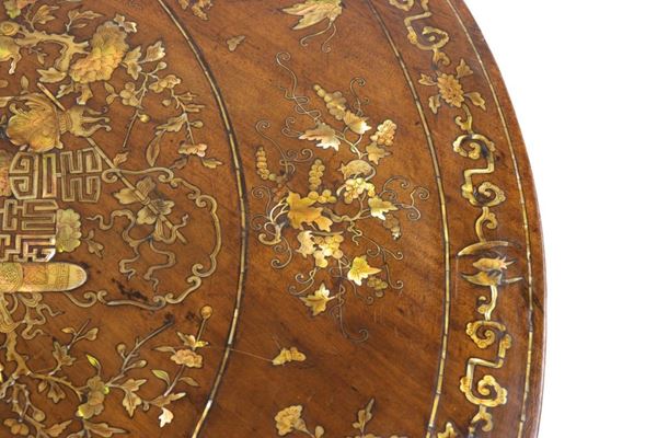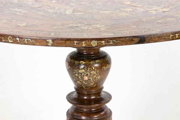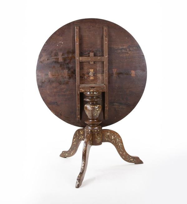 di gusto orientale, a vela, in noce finemente decorato con piano circolare interamente intarsiato in madreperla con motivi floreali e vegetali, poggiante su una base a treppiede.