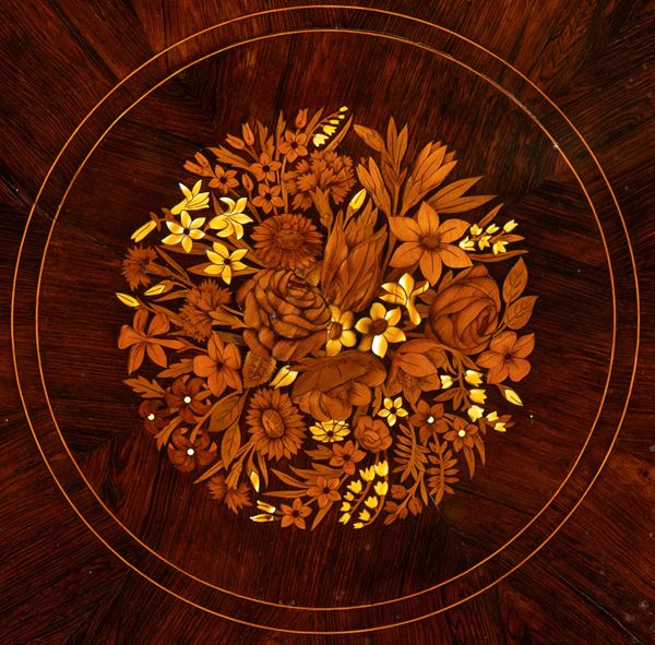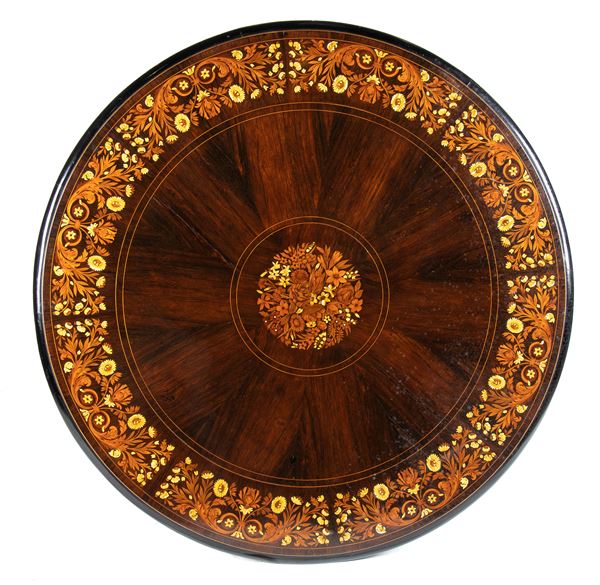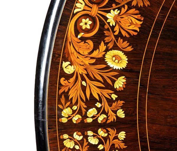 in legno di palissandro, finemente intarsiato in osso e legni di frutto a motivi floreali, sul bordo e nella parte centrale. Il piano è sorretto da una base tripodein legno di noce nel classico stile vittoriano.