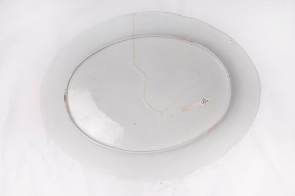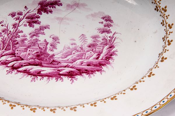 Forma ovale polilobata con appoggio ad anello su fondo ribassato. Dalla ripida tesa con corta balza ed ampio fondo. Decoro a paesaggio in porpora su fondo bianco. Lungo l'orlo motivo ad uovo tagliato dentro nastro dal profilo dorato.