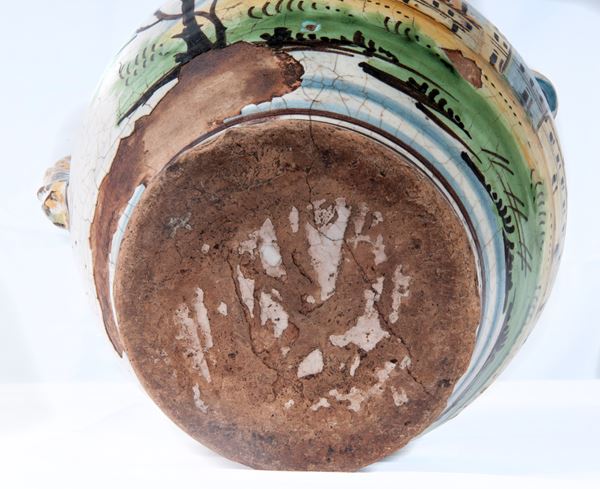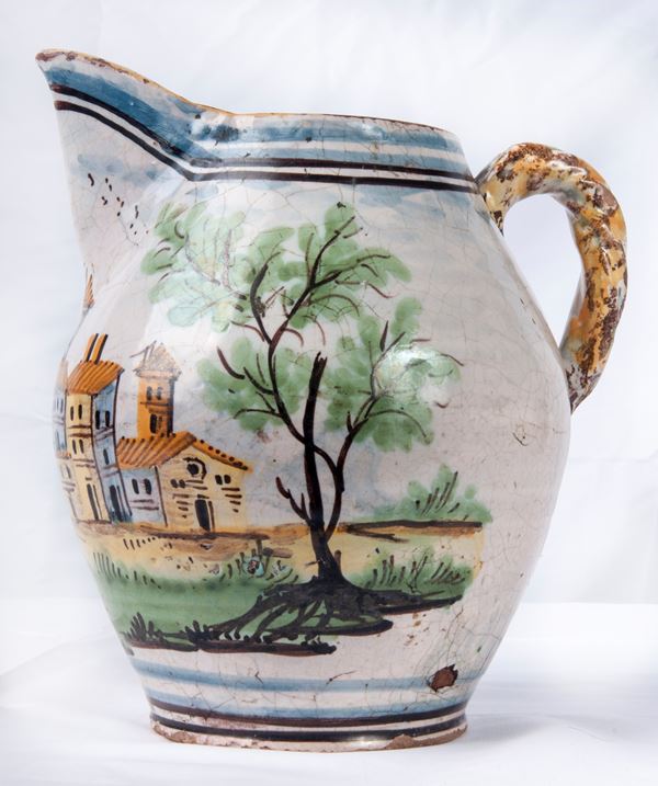 corpo globulare, con ansa a treccia e versatoio a becco di anatra. Decoro di castello con chiesa su fondo bianco. Foggiatura al tornio