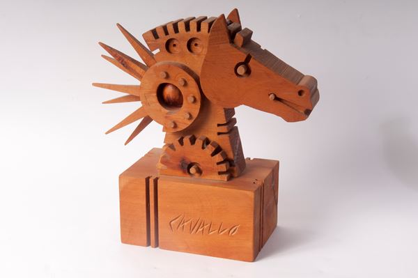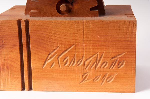 scultura in legno a tutto tondo firmata, datata e titolata.