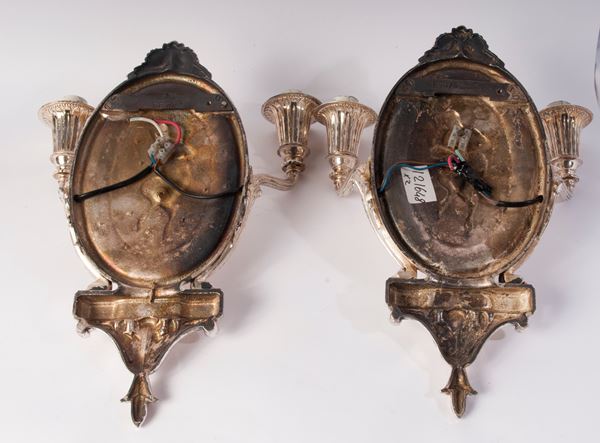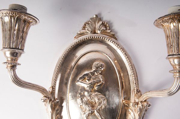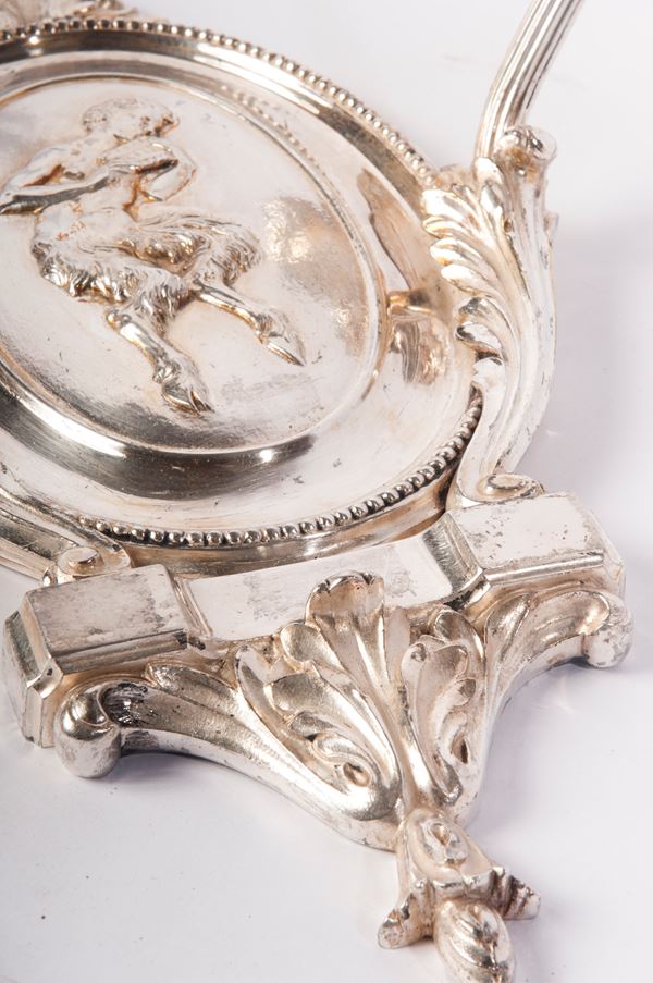 in metallo argentato di forma ovale con decorazione a foglie, a palmette e con  fauno suonante in rilievo. Stampigliate al retro.