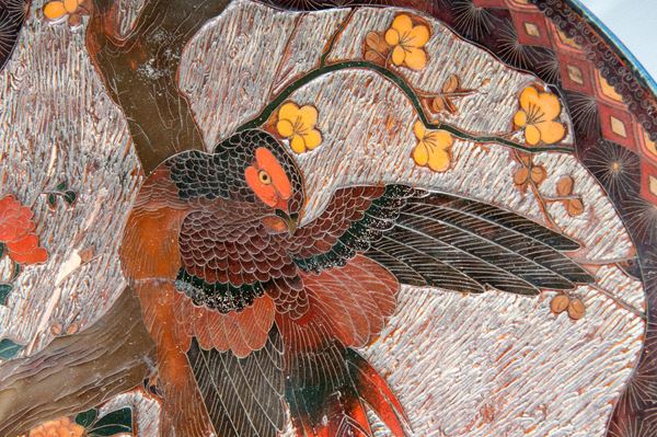 policroma a tutto fondo con scene di genere ad alberi ed uccellini tratti dal repertorio dell'estremo oriente. Decorazione a rilievo nello spessore dello smalto. Al retro appoggio ad anello su fondo ribassato in monocromia bianca con decoro floreale in blu cobalto.