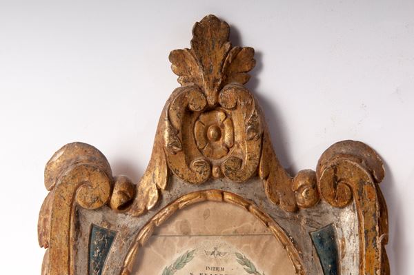 di diversa dimensione, in legno dorato, scolpito ed inciso. Forma leggermente a cuore con elementi fogliacei e piedi ferini di ornamento.