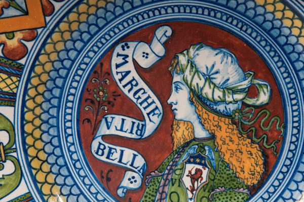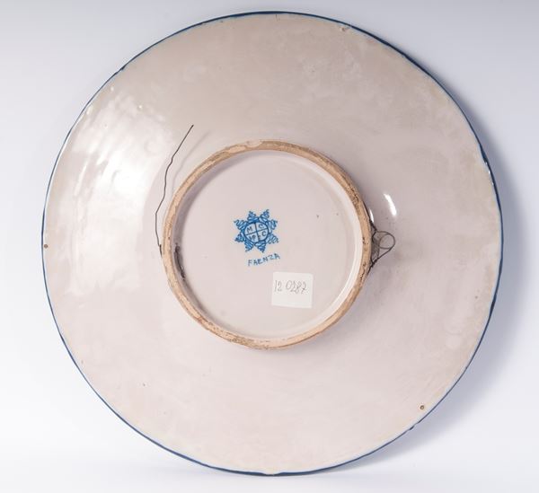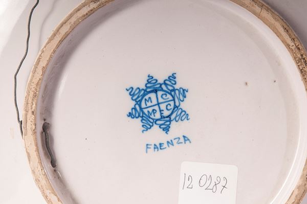 piatto da pompa in ceramica policroma con ampia tesa, corta balza e vasto fondo. Decoro della tesa a metope e triglifi a motivi geometrici ,floreali ed embricati. Fondo con al centro Margherita bella di profilo su fondo ocra. Al retro appoggio ad anello con fondo ribassato in monocromia bianca. Al centro in blu sotto smalto marchio del opificio " manifattura ceramica faentina" di Massimo Popper .