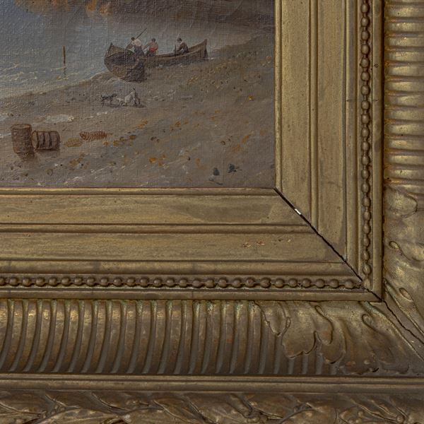 Scorcio di marina con barche, persone e costruzioni, fine XIX secolo