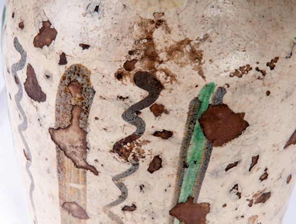 di forma a balaustro leggermente rastremato verso il basso. Decoro con con bande verticali in verde ramina e bruno di manganese.