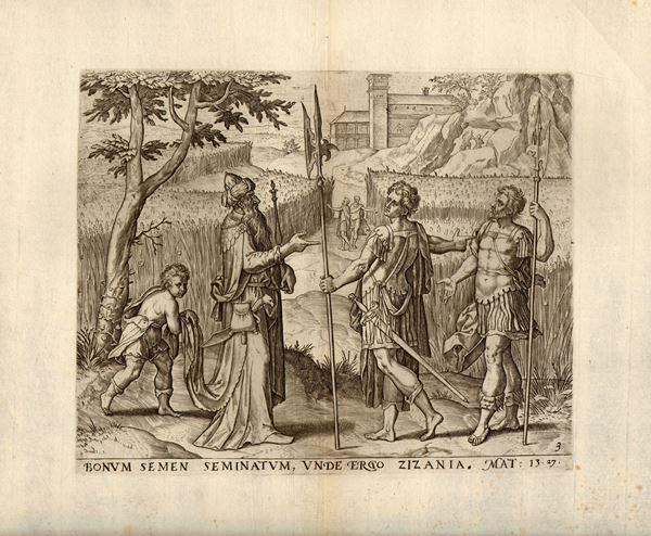Da Gerard van Groeningen. Lotto di tre tavole tratte dalla serie "Theatrum Biblicum...". Bulino, 201 x 248 mm ca. (cad. lastra), 325 x 376 mm (cad. foglio). New Hollstein (Gerard van Groeningen) 93,94,95.