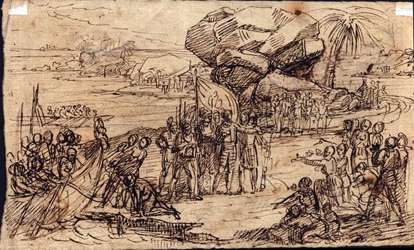 Recto: studio di colore per uno sbarco | Verso: schizzo a inchiostro per uno sbarco, Artista neoclassico