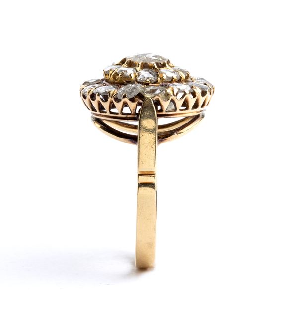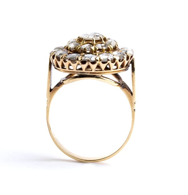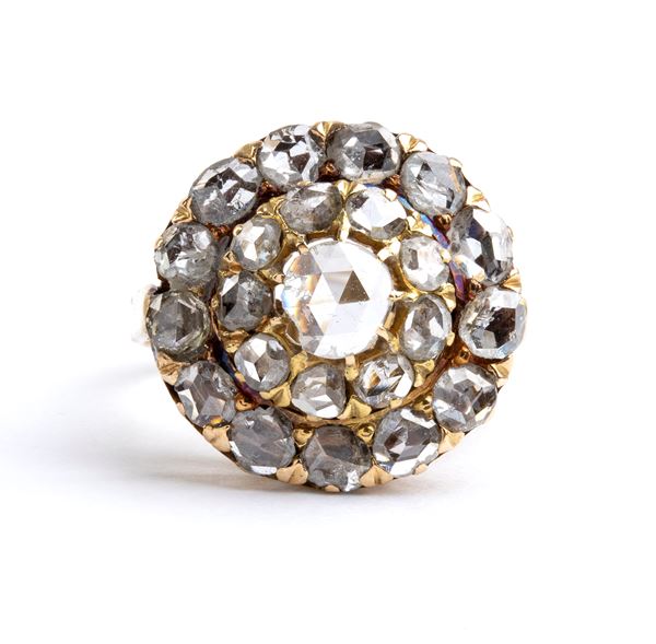 in oro giallo, incastonato con diamanti taglio a rosa.
