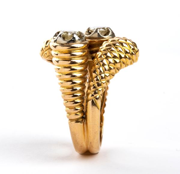 in oro giallo a disegno baccellato ed a a pigna, incastonato con diamanti.