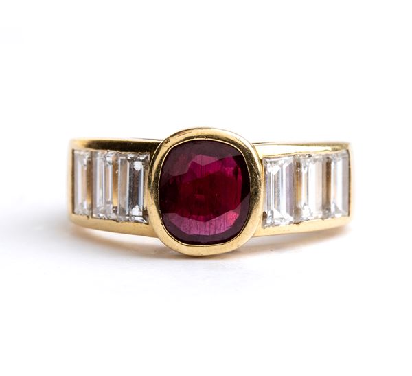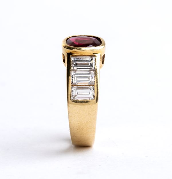 in oro giallo 18k, incastonato con rubino ovale affiancato da diamanti.