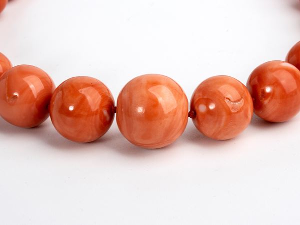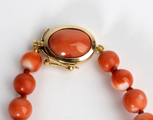 fermezza in oro 18k, ad un filo di sfere di corallo Cerasuolo (Corallum Eliatus) disposte in gradazione.