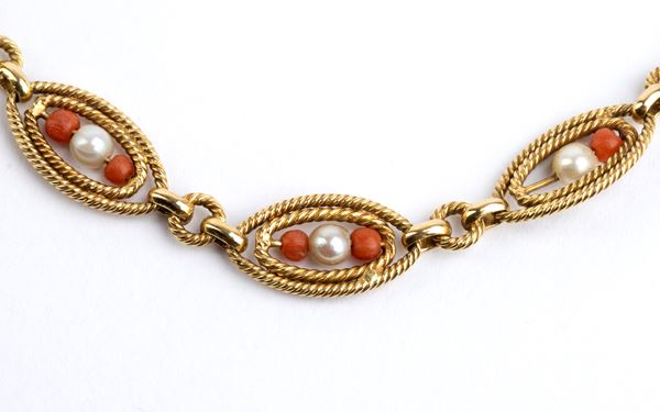 in oro giallo 18k, catena a maglie ovali con doppio motivo a cordonetto, perle e piccole sfere di corallo Mediterraneo (Corallum Rubrum).