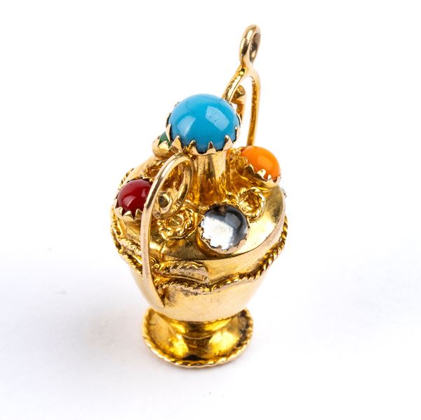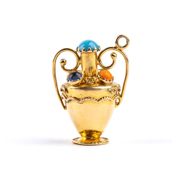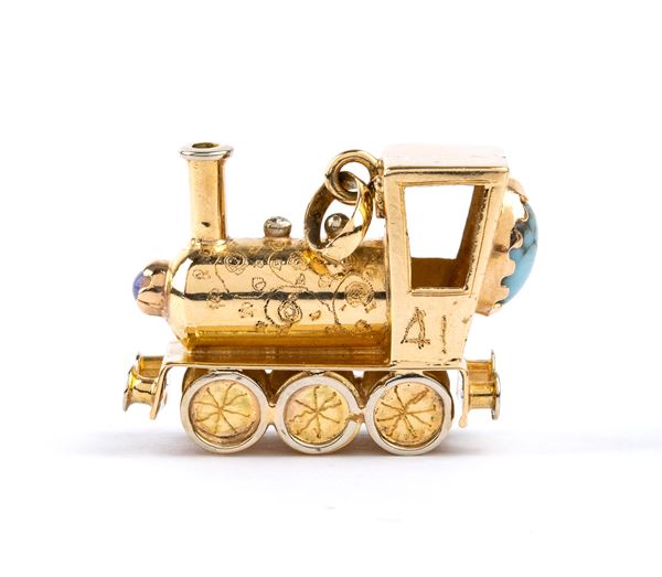 in oro giallo, un pendente a forma di anfora ed uno raffigurante una locomotiva, decorati con paste vitree.