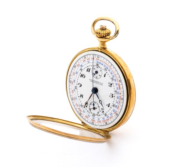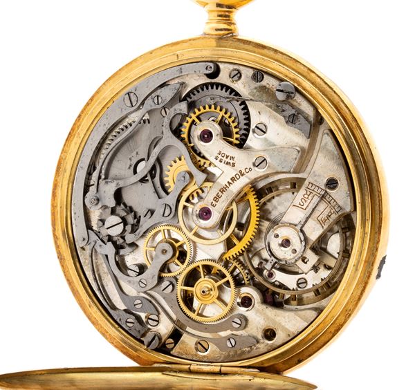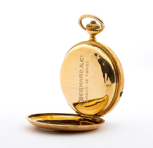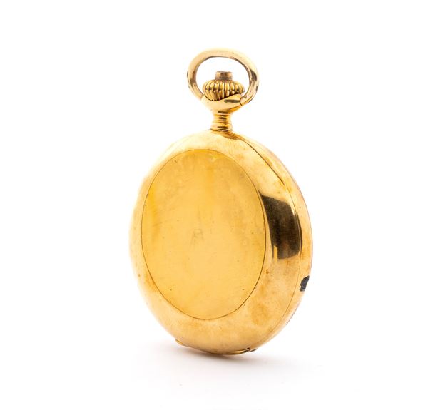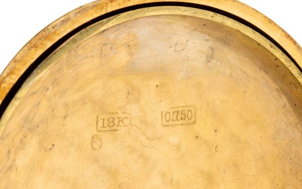 cassa in oro, quadrante in ceramica con diversi colori (nero, rosso, blu). Movimento meccanico a carica manuale. Matricola 180396.
