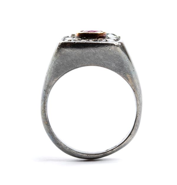 in argento di forma rettangolare, incastonato con un ruibino contornato da diamanti.