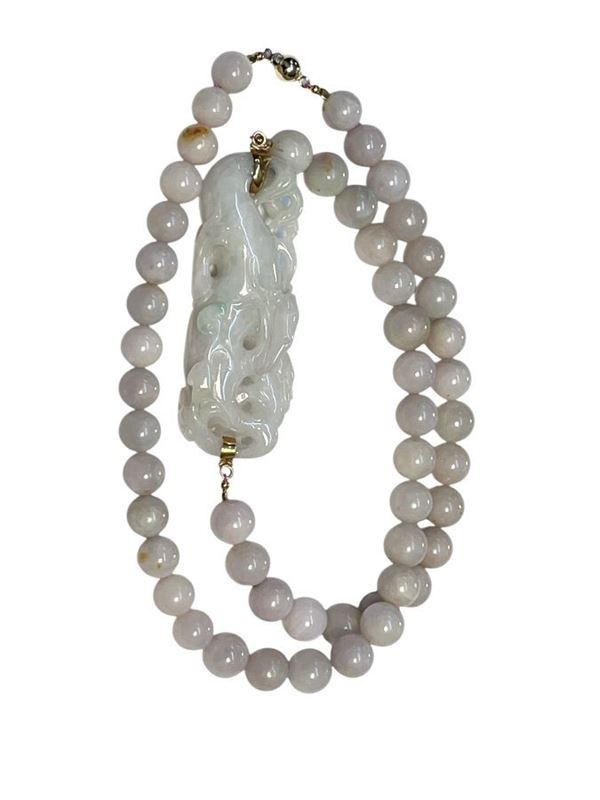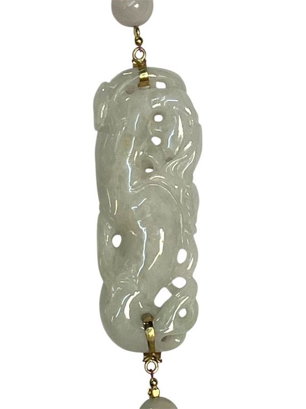 ad un filo di sfere di giadeite con elemento centrale intagliato a motivi floreali ed elementi della tadizione culturale orientale, montaggio in oro giallo.