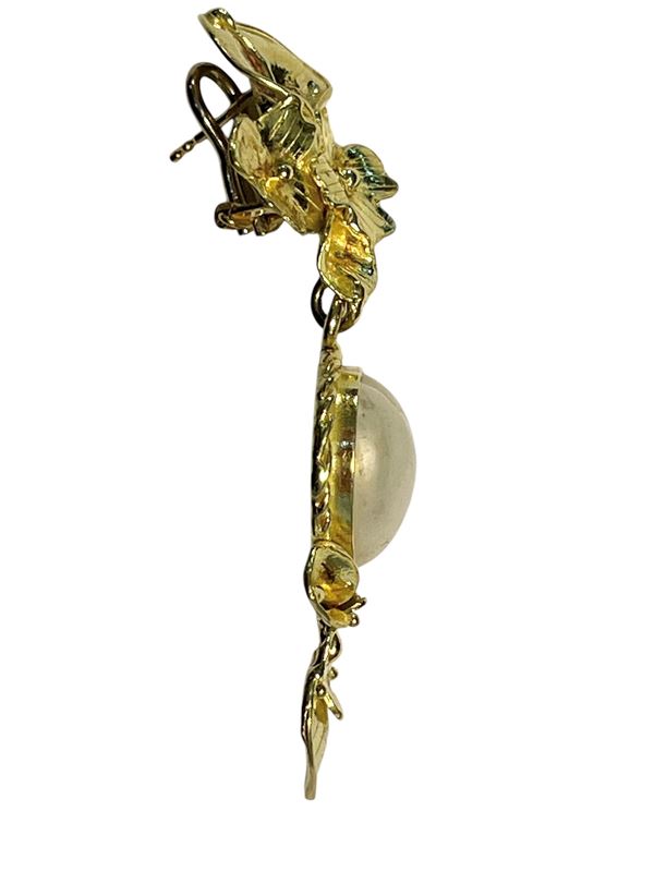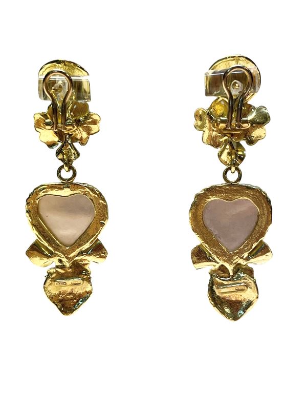 montatura in oro giallo 18k lavorata a motivi floreali, impreziositi da una coppia di perle Mabè a forma di cuore posta al centro degli orecchini. Con perno.