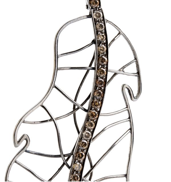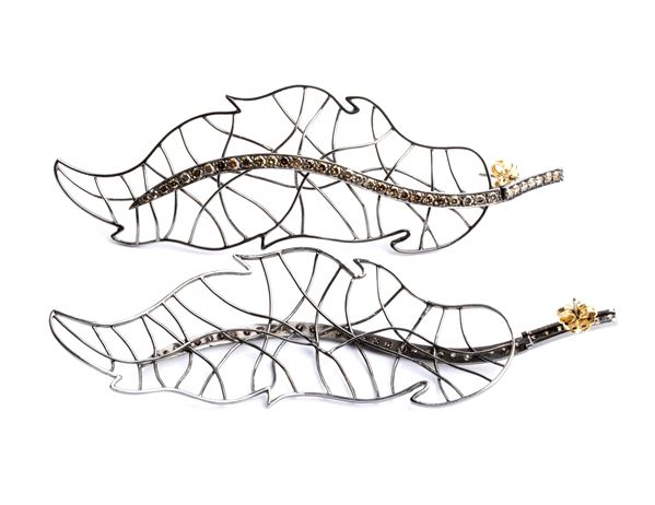 in oro bianco con applicazione di rodio, ciascuno a forma di foglia stilizzata, decorato con linea di diamanti.
