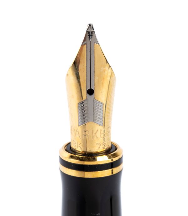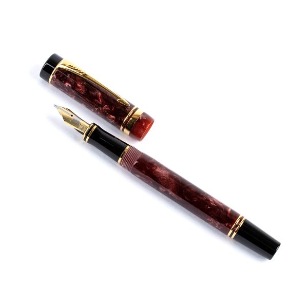 corpo in resina rossa con dettagli in resina nera e dorati, pennino in oro 18k.