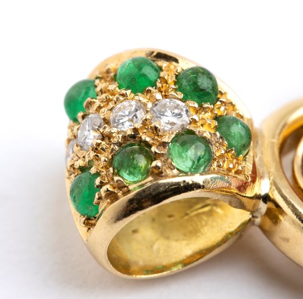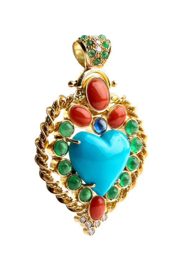 in oro giallo, incastonato con un turchese centrale a forma di cuore, contornata da smeraldi cabochon, zaffiro cabochon, cabochon di corallo Mediterraneo (Corallium Rubrum) e diamanti.