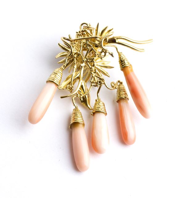 in oro giallo 18k, motivo di fiori in smalti e diamanti, con 5 elementi pendenti a goccia in corallo rosa (Corallium Deep Sea).