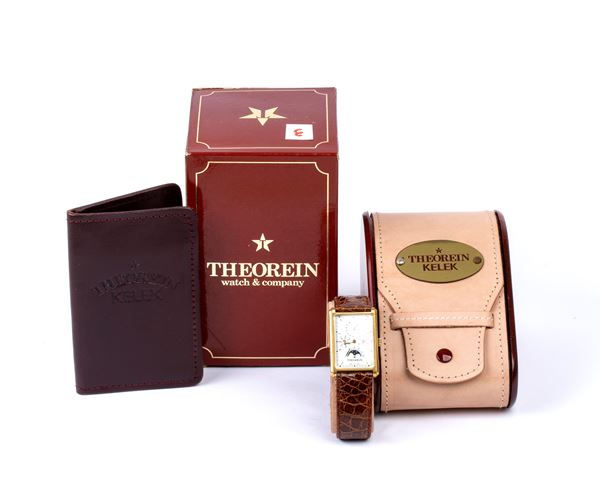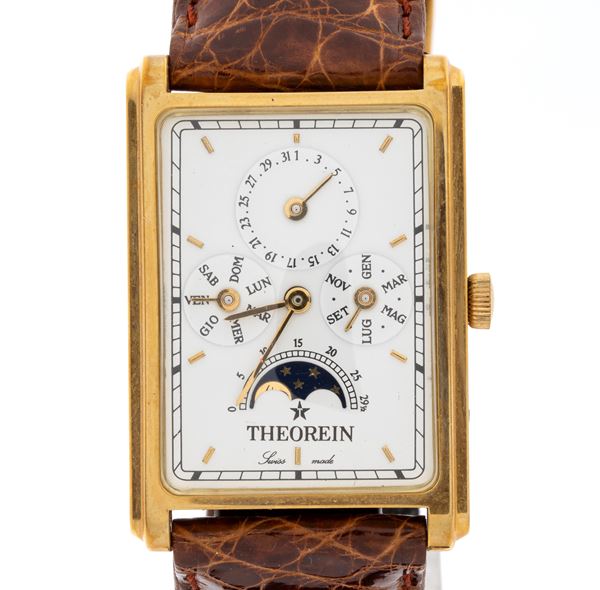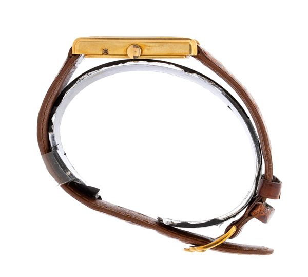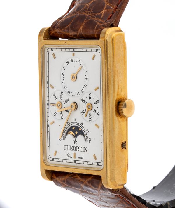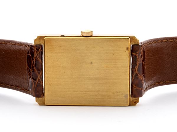 cassa in oro di forma rettangolare con quadrante bianco, data, giorno, mese e fasi lunari. Movimento meccanico a carica manuale.