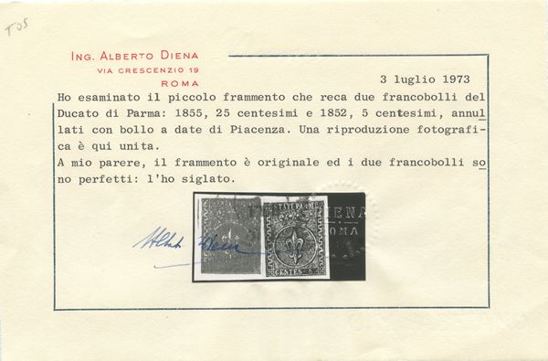 1853 - affrancatura mista I + II emissione composta da 5 cent. n.1 + 25 cent. senza la scritta ''cent 25'' non quotato. Insieme probabilmente unico. (A+) (cert. Alberto Diena)