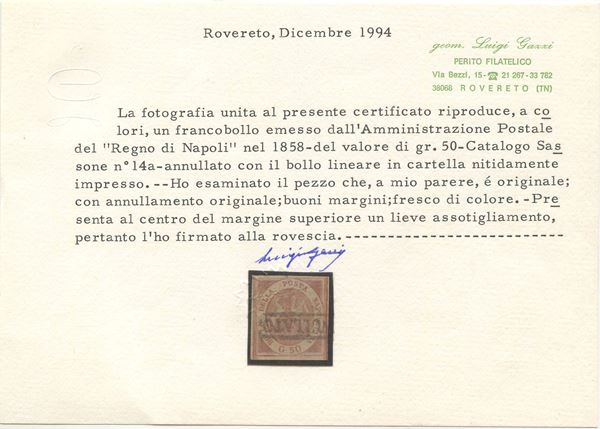 1858 - La serie n.1/14 di qualità mista, mediamente buona. Cat. 12.700. (A/A-) (Cert. Gazzi per il 50 gr.)