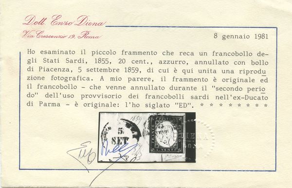 5.09.1859 - 20 cent. usato a Piacenza nel II periodo di utilizzo di questi francobolli durante il Gov. Provvisorio. (A-) (Cert. Enzo Diena, Emilio Diena))