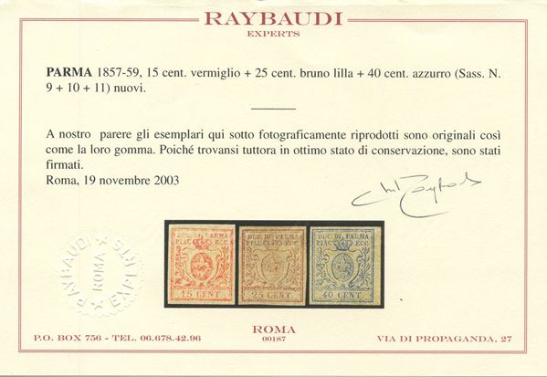 1857 - la serie n.9/11 nuova con gomma, linguellata. Cat. 3.060. (A+) (Cert. Raybaudi)