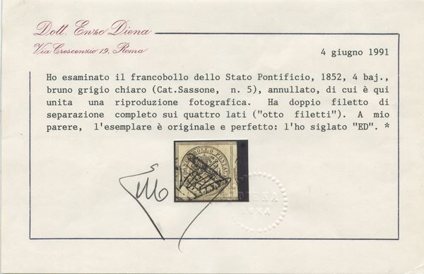 1852 - 4 baj. bruno grigio chiaro n.5 ''Otto Filetti'', usato. Cat. 1.600. (LUX) (Cert. En. Diena)
