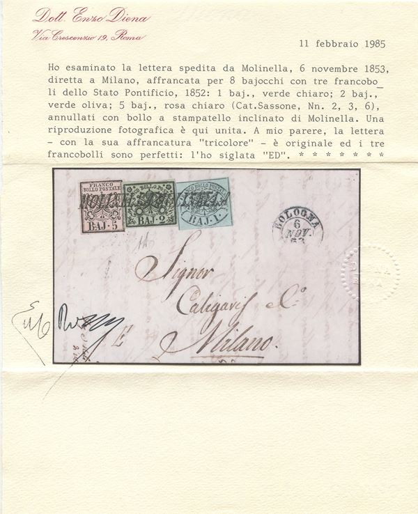 06.11.1853 - Lettera spedita da Molinella per Milano ed affrancata per 8 baj tramite un 1 baj verde azzurro n.2a, 2 baj. verde oliva n.3 ed un 5 baj. rosa chiaro n.6, tutti di ottima qualità. Lo splendido e poco comune insieme è firmato Vaccari, Alberto Diena ed è certificato da Enzo Diena. (A+) (Cert. En. Diena, Alberto Diena, Vaccari)