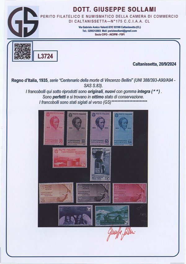 1935 - Bellini serie completa comprensiva della posta aerea n.388/393 + A90/A94 nuova con gomma integra MNH. Certificato Sollami.