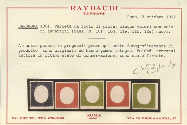 1854 - Valori non emessi con colori invertiti n. 10f, 10g, 11e, 11f e 12d, Serie splendida, quasi tutti con bordo di foglio e con gomma integra. Cat. 16.700++. (LUX) (Cert. Raybaudi)