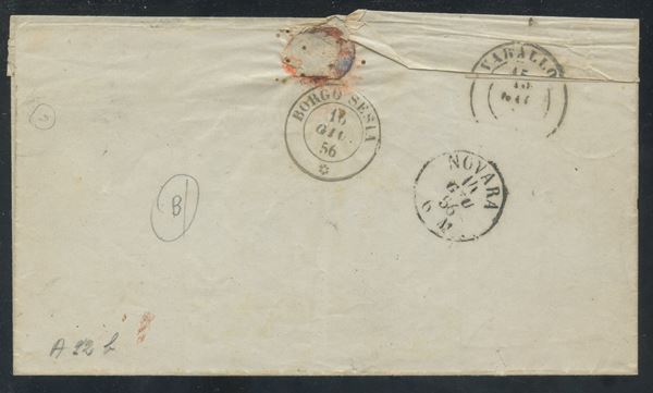 13.06.1856 - Busta affrancata tramite un 20 cent. celeste n.15f annullato a Balmuccia (10pt.) spedita inizialmente a Vercelli e poi rispedita a Borgosesia. Splendido insieme. (A+)