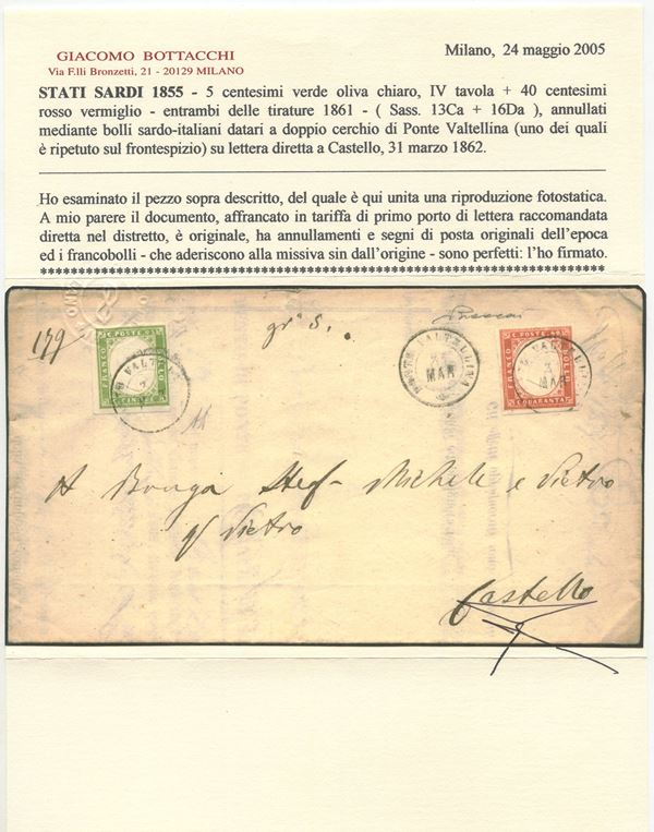 31.03.1862 - Lettera per il distretto raccomandata da Ponte Valtellina per Castello affrancata per 45 cent. tramite un 5 cent. verde oliva chiaro n.13Ca + 40 cent. rosso vermiglio n.16Da. Entrambi i francobolli sono perfetti e freschissimi ed il documento perfettamente conservato. Insieme di grande bellezza e rarità. (LUX) (Cert. Bottacchi)