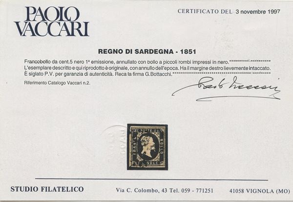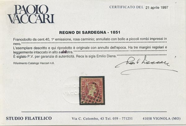 1851 - la serie n.1/3 usata. Cat. 14.100. (A-) (Cert. Vaccari per i due alti valori)