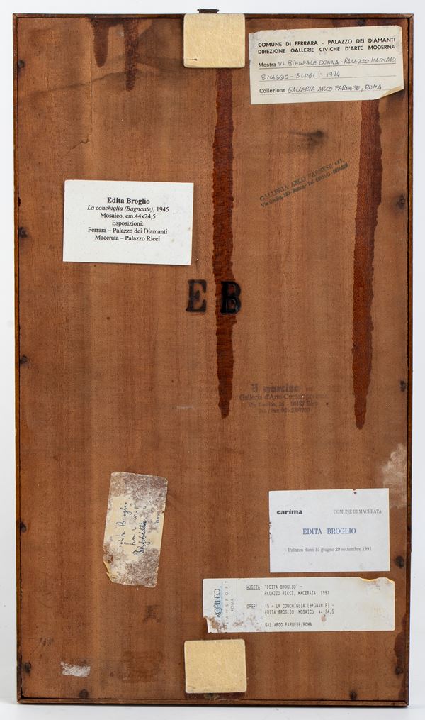 Al retro varie etichette e timbri: mostra Palazzo dei Diamanti, Ferrara, 8 maggio - 3 luglio 1994; mostra Palazzo Ricci, Macerata, 15 giugno - 29 settembre 1991; timbro della Galleria Il Narciso di Roma e della Galleria Arco Farnese di Roma più iniziali incise dell'artista