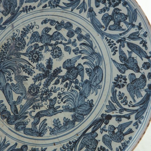 Orlo tondo liscio leggermente rialzato, con piede circolare a campana e dal corto collo. Decoro "calligrafico naturalistico" in blu su fondo bianco.