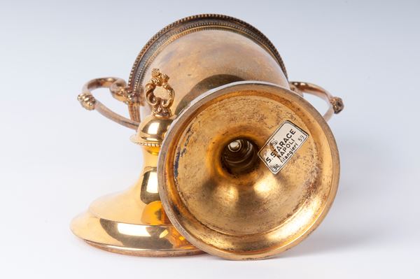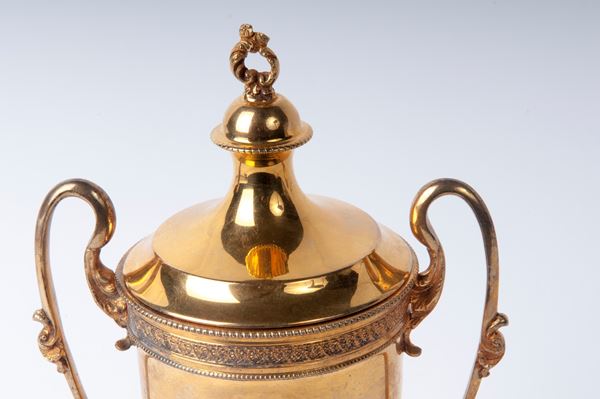 impugnature ad ansa con innesto a fiori e coperchio con presa a riccio. Gr 337, punzonatura italiana in parte cancellata di difficile lettura.