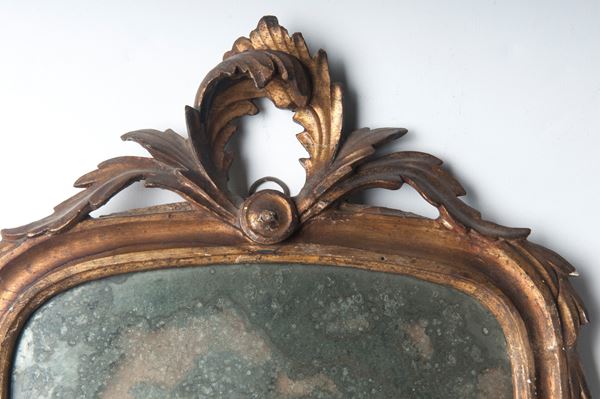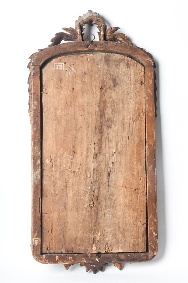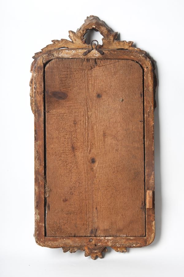 con portacandele in legno dorato. Di forma rettangolare con angoli tondi, decoro floreale alla base ed alla sommità cimasa con fronde di foglie a riccio.