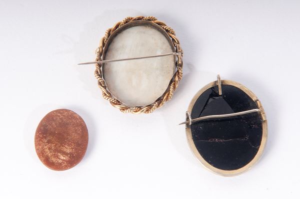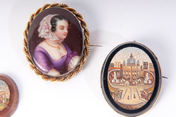 raffiguranti piazza S. Pietro 3,5 x 3 cm con castone a spilla; Colosseo slegato 2,5 x 2 cm; giovane fanciulla su porcellana con castone montato a spilla 4 x 3 cm