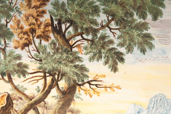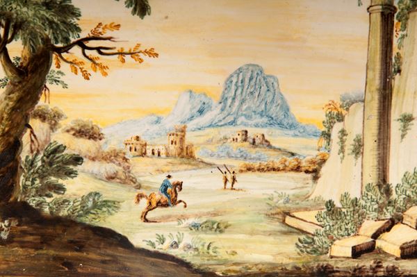 Decoro con paesaggio con architetture e personaggi. Bordo in giallo di antimonio.