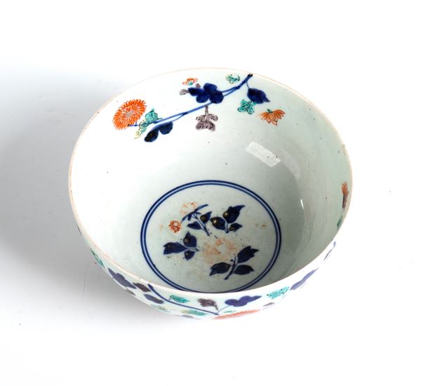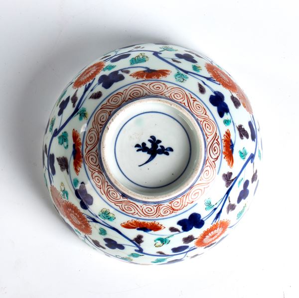 Ciotola "Imari" decorata in blu sottocoperta e smalti policromi con piante e fiori di crisantemo nella parte esterna, fiori di peonia sul fondo.