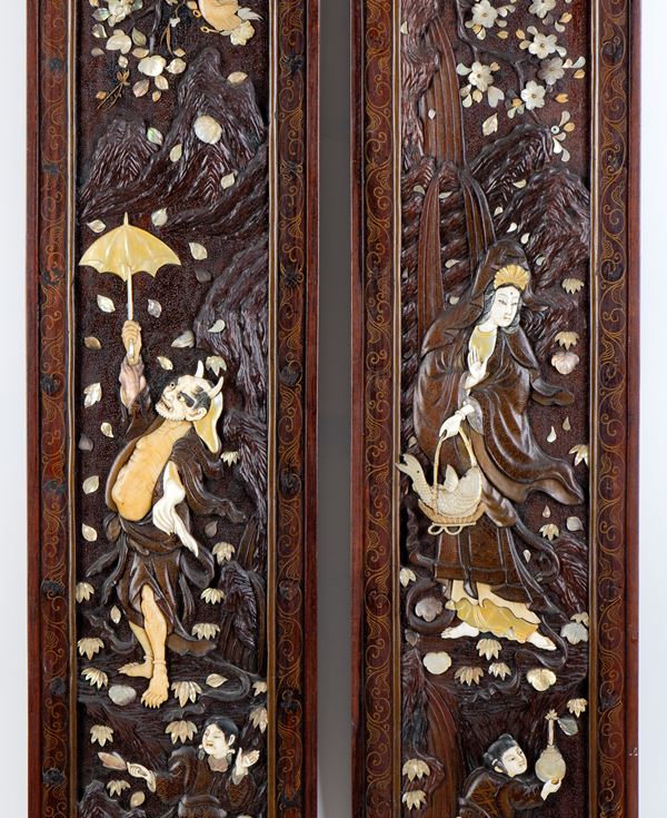 Coppia di pannelli Shibayama intagliati, Giappone, periodo Meiji (1880-1890)