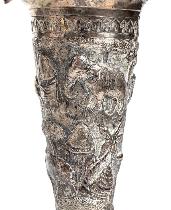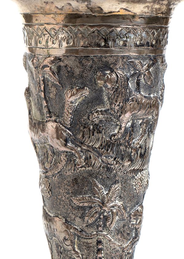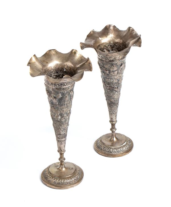 Coppia di alti vasi argentati dal corpo affusolato a forma di tromba e bordo svasato ondulato, finemente lavorati a rilievo con scene di caccia e animali selvatici.