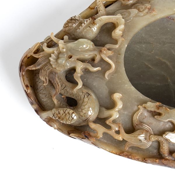 Questo grande vasca in giada, intagliato da un grande blocco di giada verde semi traslucida con venature marroni proveniente dalla regione di Khotan, è finemente decorato con tre draghi a rilievo tra nuvole lavorate al traforo. Sulla base è incisa una poesia di cinquantasei caratteri dell'imperatore Qianlong composta nell'anno 癸丑 guichou, corrispondente al 1793, seguita da due piccoli sigilli: un terzo, grande sigillo quadrato è intagliato a destra del poema.